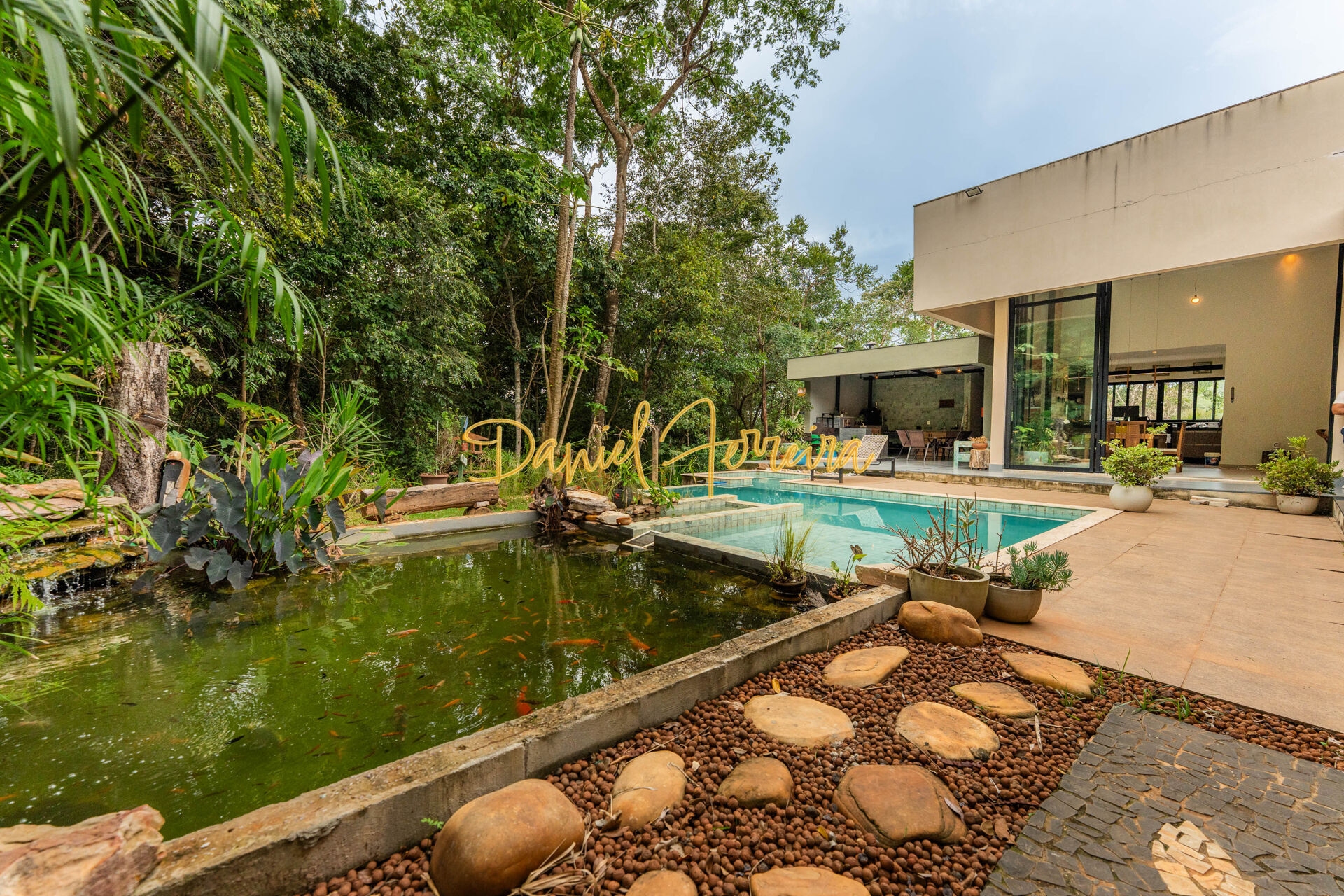 Lote duplo, com 2.440 m², sendo dois lotes juntos, com fundo e lateral para reserva. Destaque para o amplo quintal arborizado, com lago de peixes e piscina. Ideal para quem valoriza contato com a natureza e qualidade de vida.